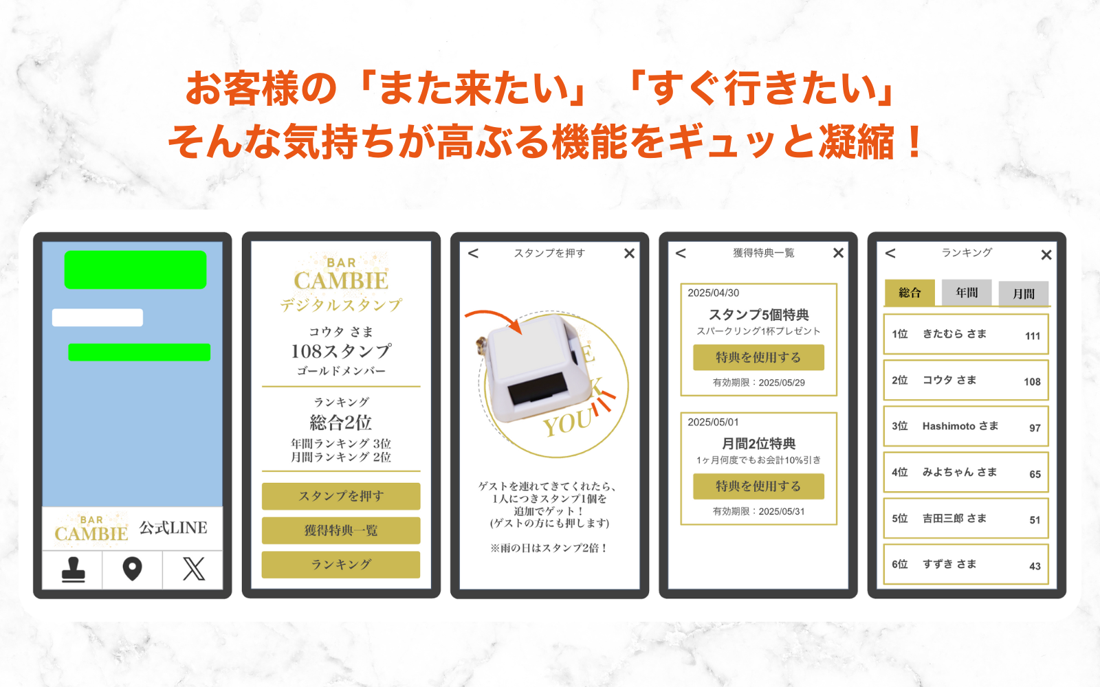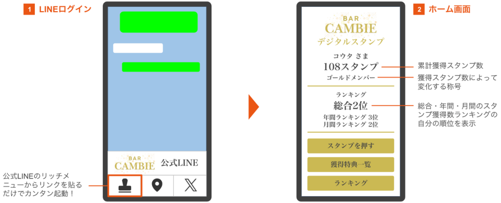 獲得したスタンプ数や称号、ランキングなどのお店に”通った”実績が表示され、お客様のファン度を可視化。