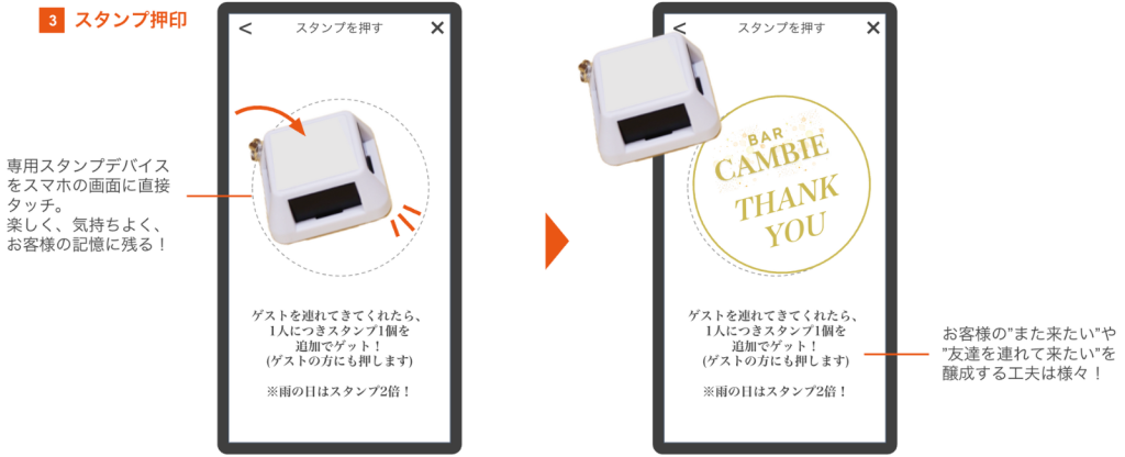 | ③スタンプ押印 | スマホに専用スタンプデバイスをタッチして押印、スタンプを1つ獲得 |