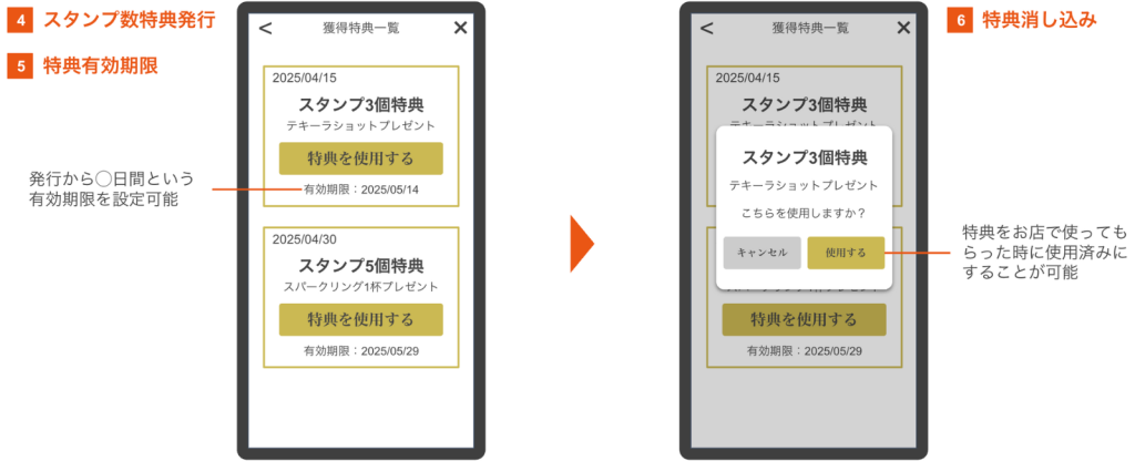 ④スタンプ数特典発行・⑤特典有効期限・⑥特典消し込み