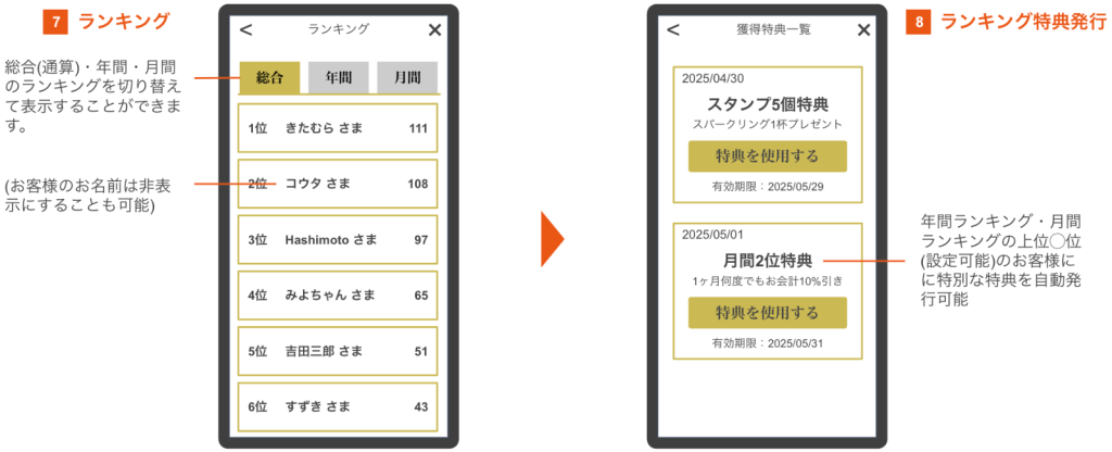 スタンプ押印数のランキング機能を搭載。さらにランキング上位のお客様には特別な特典が発行可能。